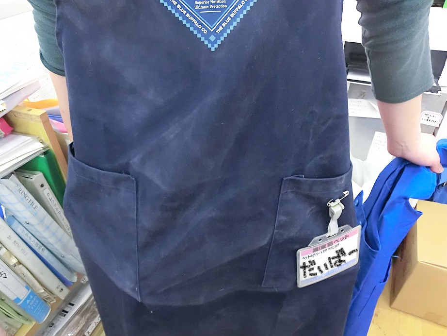 オシャレなネイビーカラーのブルーバッファローエプロンはホッホーの脂粉で真っ白…
