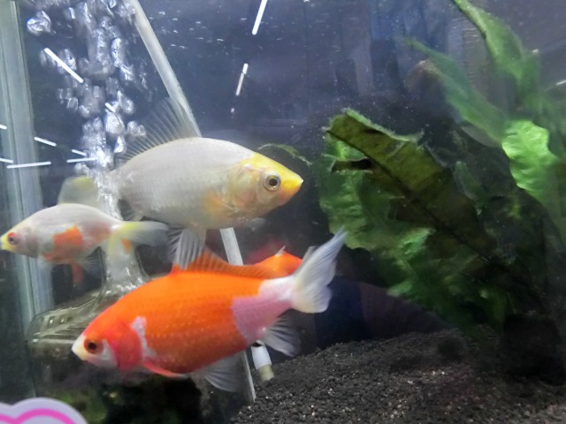 デモ水槽の中に住む4匹の金魚たち。