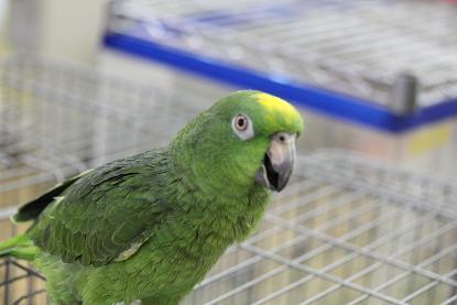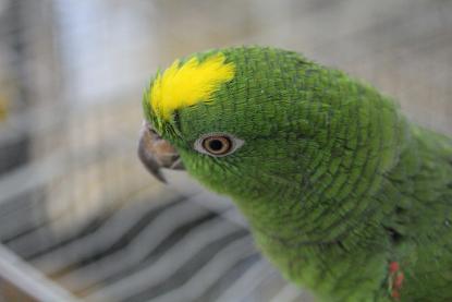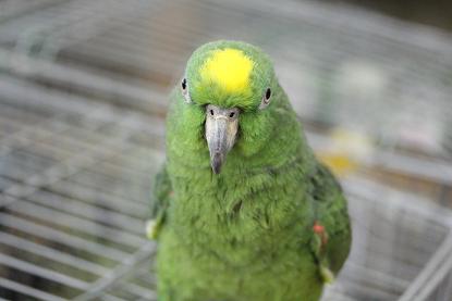 額きらびやか 「キビタイボウシインコ 」。